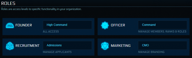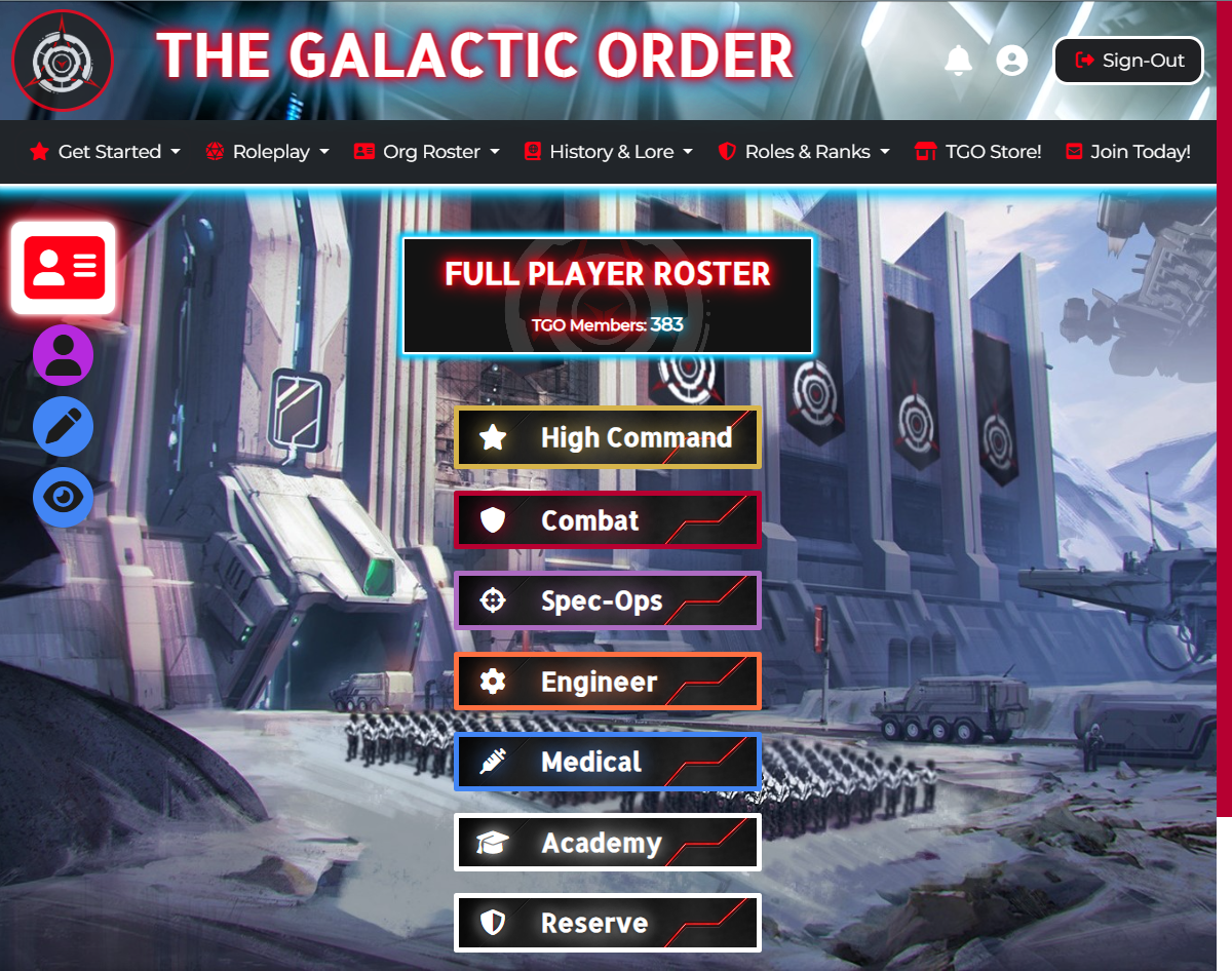 When a new member joins The Galactic Order following application approval, they are assigned the rank of Novitiate. This role has limited armor and zero authority, but gains access to nearly all Division gameplay options within the org.