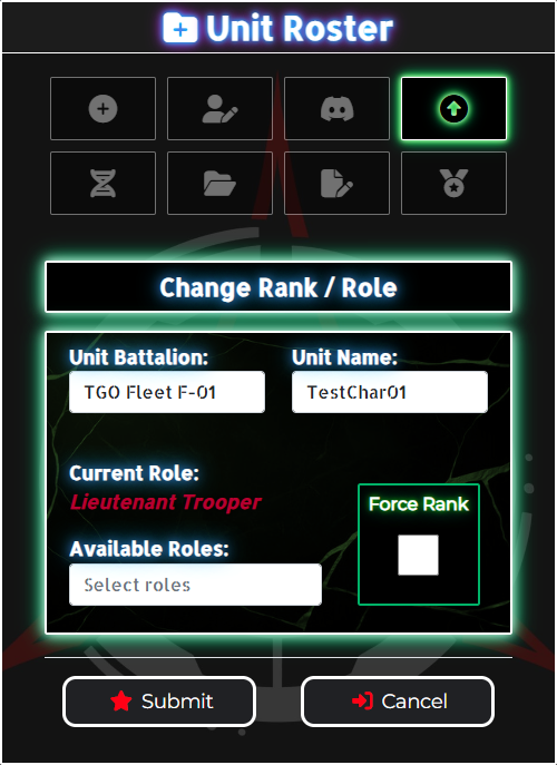 Reserve status will set the member’s Rank to E-0, Battalion to “None” and change their Role to “Reserve”.