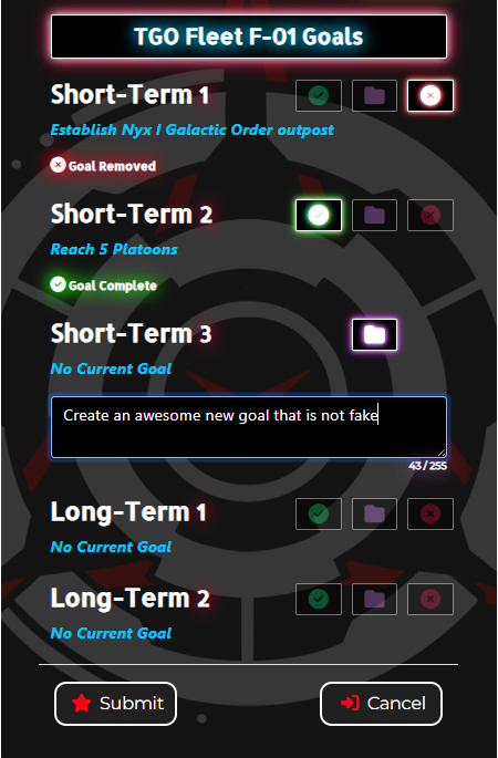 3.1 Officers are responsible for tracking progress with any completed Events, Patrols & Missions of a unit that reports for Duty. Officers then submit all reports directly to The Galactic Order Roster.